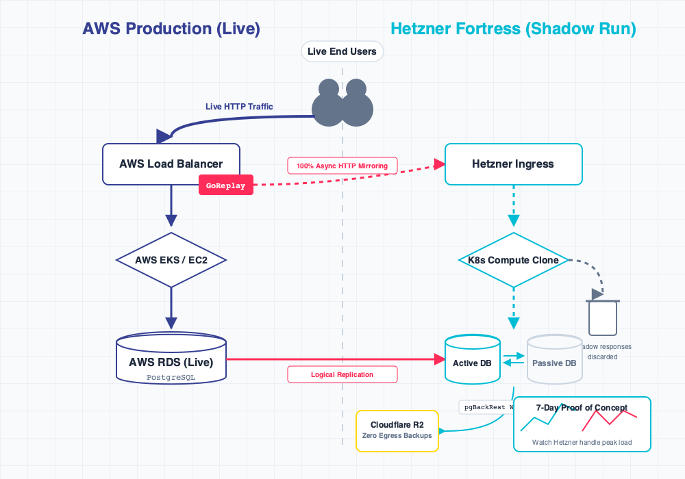 We don’t do terrifying cutover weekends. We build a 1:1 replica of your compute on Hetzner, continuously replicate your live AWS RDS to our Hetzner DB, and mirror 100% of your incoming HTTP traffic to the clone. You watch the Hetzner dashboard handle your exact peak workload safely for 7 days before you switch.